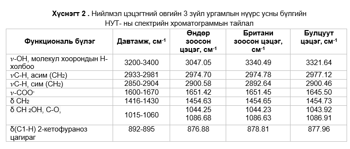 Нүүрс усны бүлгийг нил улаан туяаны (НУТ) спектрээр тодорхойлсон дүн: Булцуут цэцэг, Өндөр зоосон цэцэг, Британи зоосон цэцгийн газрын дээд хэсгийн нүүрс усны бүлгүүдийн бүтцийг НУТ-ны спектрээр тодорхойлж, стандарт бодис болгож сахарозтой харьцуулан, тодорхойлсон (Зураг 2).